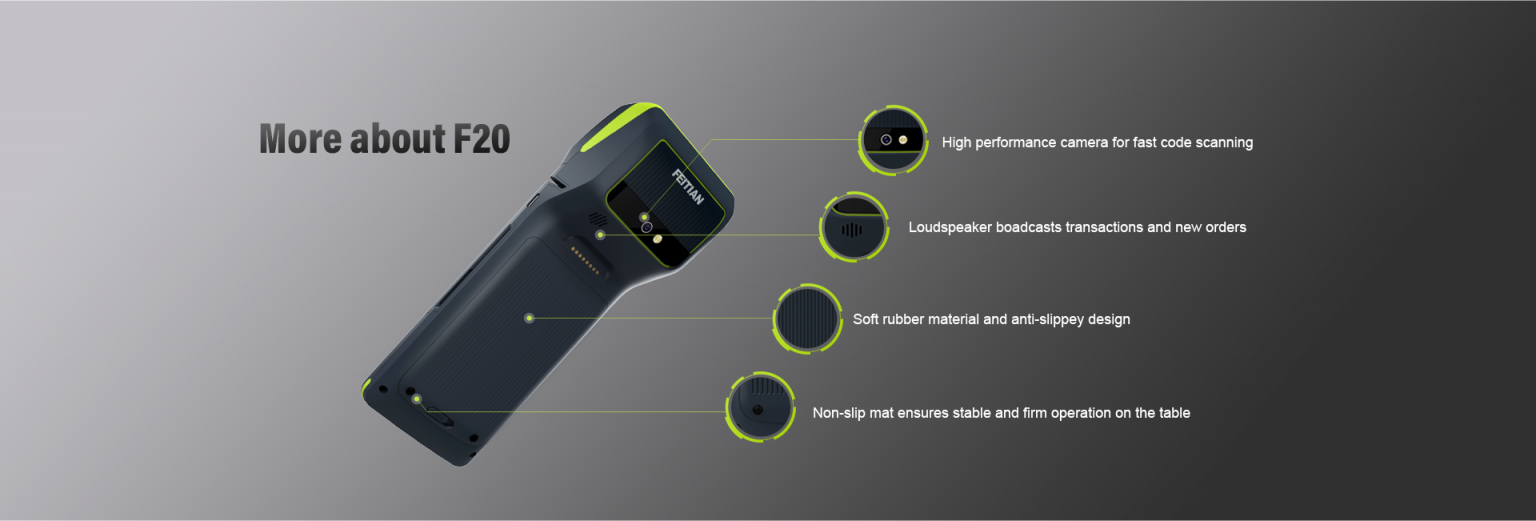 Android14, high-speed printer, high-voltage battery, smart design, all kinds of reliability tests, embedded fingerprint module and so many more are integrated into a smart wireless terminal, FEITIAN F20 for better business.